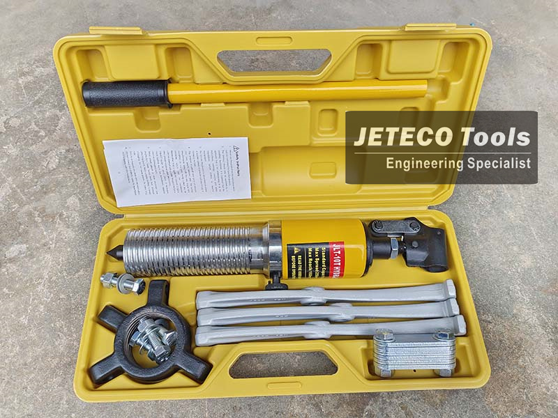 10 ton hydraulic bear puller tool set within plastic carrying box.