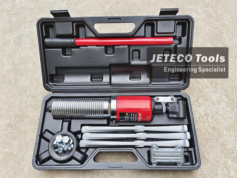 Complete 20 ton hydraulic bear puller tool set within plastic carrying box.