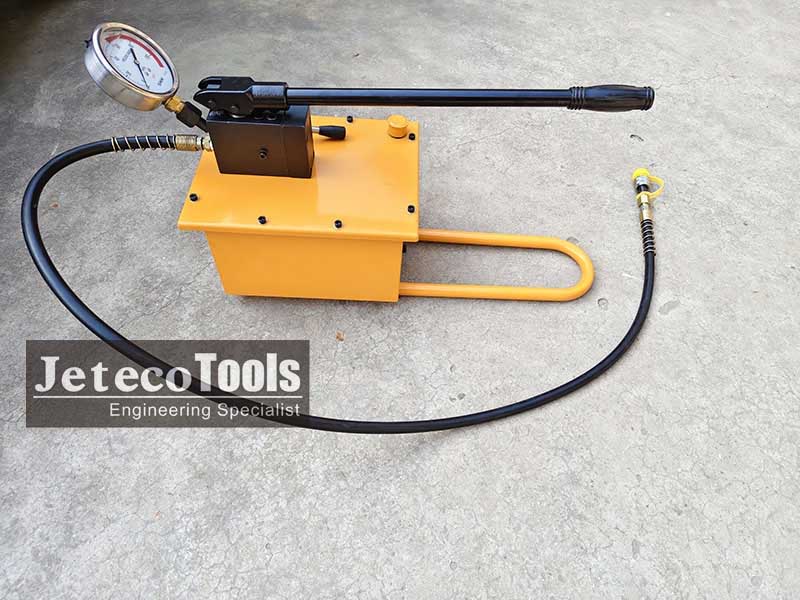 P464S single acting hydraulic hand pump, steel oil tank with 7L oil capacity, and pressure gauge.