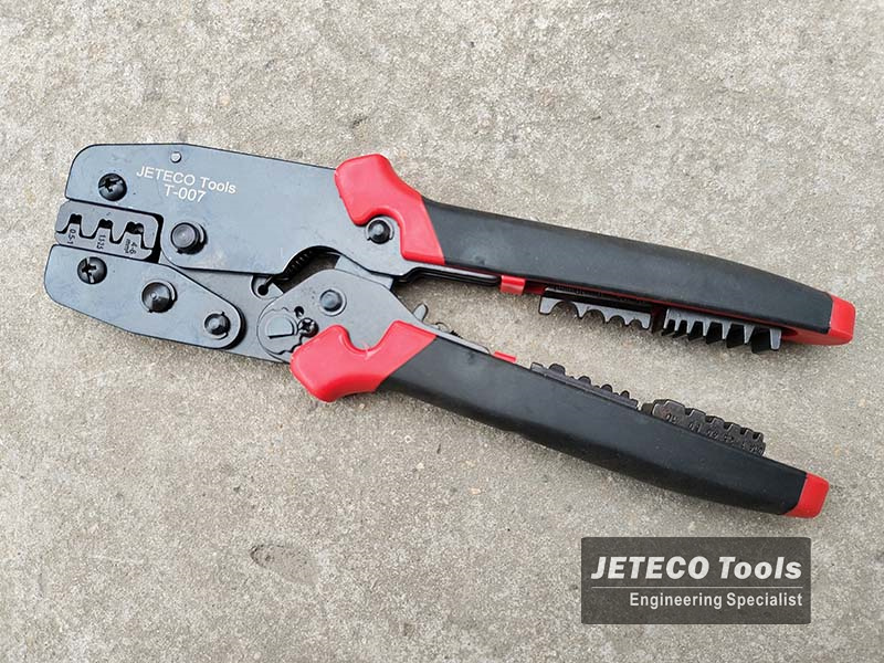 T-007 ratchet crimping tool, is a handheld crimper tool with three crimping jaws.
