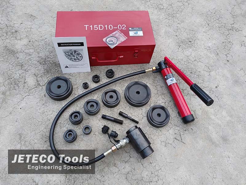 T15D10 15 ton 10 dies hydraulic knockout hole punch kit, including a 15-ton hydraulic hand pump punch tool, 10 sizes hole punches, draw stud bolts and washer.